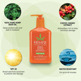 Protect skin from the sun, and help repair existing damage, with our water-resistant body lotion with broad-spectrum SPF sunscreen and moisturizing hemp seed oil.